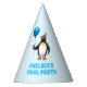 Pinguim doce com um balão em chapéus de festa para a festa de aniversário deste verão.