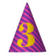 Uma fúcsia ousada e brilhante e um chapéu de partido púrpura com um número de idade personalizado amarelo é uma adição divertida à festa de aniversário de qualquer criança.