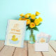 Um pato sortudo! Primeiro aniversário com pato de borracha e bolhas contra gingham azul claro e fundo amarelo pálido com texto laranja