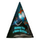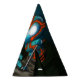 Um robô tropeça sobre uma borboleta à noite em um campo de grama que capta sua atenção. O robô está muito intrigado pela borboleta que tem um feixe de luz iluminando a partir dos olhos para ter uma visão melhor. Um design bonitinho em chapéus de festa para festas de aniversário de meninos.