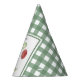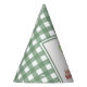 Festa de aniversário de criança de Aquarela. Watercolor Dino no chapéu de aniversário, bolo com velas, balão vermelho. Fundo de gaiola verde.