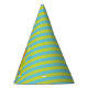 Este chapéu do partido caracteriza uns grandes três na laranja e o amarelo cercado por um stegosaurus azul e por um rex verde do tiranossauro (t-rex) que vestem chapéus do partido e que guardaram um presente. As estrelas verdes, azuis, alaranjadas e amarelas cercam a parte superior da imagem.