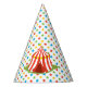 Este chapéu temático do partido do circo caracteriza um teste padrão de repetição de estrelas vermelhas, amarelas, azuis e verdes e de um gráfico do clipart de uma barraca listrada vermelha e branca de Cirucs (a tenda de circo)
