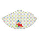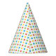 Este chapéu temático do partido do circo caracteriza um teste padrão de repetição de estrelas vermelhas, amarelas, azuis e verdes e de um gráfico do clipart de um motor vermelho do trem do circo que leva um palhaço engraçado com cabelo azul.