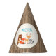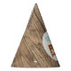 Chapéu bonito da festa de aniversário dos animais da floresta que caracteriza um fundo de madeira e quatro animais bonitos da floresta em um fundo circular fora branco.