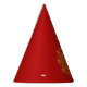 Chapéu elegante de papel vermelho e ouro. Ideal para ocasiões festivas especiais. Fundo vermelho com um ornamento inspirado em árabe ouro no estilo moderno. Abstrato, ilustração, elegante, geométrica, moderna, étnica, barroca, luxo, árabe, muçulmano, motivo.
