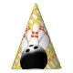 As bolas de boliche e os pinos compo este chapéu do papel do divertimento. Customizável assim você pode adicionar seu próprio texto e mudar a cor do fundo. Excelente para seu partido seguinte!.
