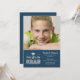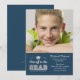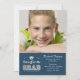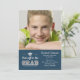 Um convite azul e cinzento com as palavras "chapéus fora ao formando" e a um motivo do boné de formatura.