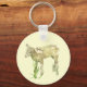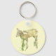 Este chaveiro apresenta um carneiro doce com apenas três semanas de idade. Ele está balançando grama contra fundo amarelo.