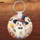 Adicione um toque de doçura assustadora ao seu Halloween com este charmoso chaveiro com um fantasma amigável vestido de bruxa e gravata arco, segurando uma varinha mágica. Cercado por abóboras, morcegos, folhas de outono e um pequeno companheiro de esqueleto, este design é perfeito como presente.