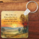 Chaveiro com a escritura de aspas inspiradoras retrata uma bela paisagem de cor d'água por pôr do sol com cores amarelas, azuis e verdes. Ele apresenta uma Bíblia amada e encorajadora Verse 1 John 3:16, "É assim que sabemos o que é o amor: Jesus Cristo deixou sua vida para nós."