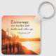 Chaveiro com uma citação inspiradora a escritura cristã retrata uma fotografia com o pôr do sol sobre a água e quatro amigos andando sobre a doca. Apresenta uma parte da Bíblia Verso 1 de Salónica 5:11, "Encorajem-se uns aos outros e construam-se uns aos outros."