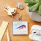 Chaveiro inspiracional retrata a bandeira americana e apresenta a Bíblia Verse 2 Crônicas 7:14, "Se minhas pessoas,... se humilharão, e rezarão, e buscarão meu rosto, e virarão de seus caminhos perversos; então eu ouvirei do céu, perdoarei seu pecado, e curarei sua terra."