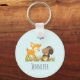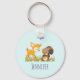 Um chaveiro com uma ilustração fofinha com veado bebê e um pequeno esquilo segurando uma bolota e uma borboleta voando sobre suas cabeças. Estas adoráveis criaturas de floresta em pé sobre uma grama com alguns cogumelos brancos perto de seus pés. Fundo azul claro.