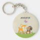 Um chaveiro com uma ilustração fofinha com veado bebê e um pequeno esquilo segurando uma bolota e uma borboleta voando sobre suas cabeças. Estas adoráveis criaturas de floresta em pé sobre uma grama com alguns cogumelos brancos perto de seus pés. Fundo castanho macio.