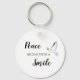Chaveiro com a citação: A paz começa com um Sorriso. Escrito com um moderno estilo escrito em preto. Com um carregando de pomba e uma folha de azeitona, o símbolo da paz.