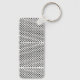 A rectangular keychain with a metal ring and a black and white polka dot pattern on both sides, set against a plain gray background.