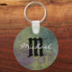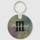 O fundo original de trabalho de arte de abstrato em tons roxos, azuis e verdes fazem a queda de trás perfeita para o seu nome e monograma inicial nesta cadeia de teclas de metal redondo.