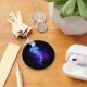 Água-viva grande, azul, desenhada artisticamente, brilhante, brilhante, com longos tentáculos sobre fundo preto com bioluminescência roxa. Água-viva luminosa.