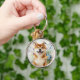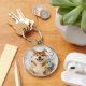 A sweet Shiba Inu or Akita dog sits with a watercolor wash of various blue flowers which makes a lovely key chain for the dog lover.