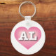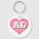 Este chaveiro apresenta um coração legal, cor-de-rosa, com um centro lavado em branco contendo as letras maiúsculas, maiúsculas, a negrito AL, a abreviação oficial para Alabama, o estado do yellowhammer.