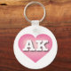 Esta chaveiro apresenta um coração calmo, legal e colecionado cor-de-rosa com um centro lavado em branco contendo as letras maiúsculas, em negrito, branco, AK, a abreviação oficial do Alasca, a última fronteira.