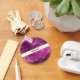 Uma cadeia chave com um design elegante abstrato. Cor de ametista roxa escura com fitas de ouro aninhadas entre estratos em camadas. Design rica e bonita. A camada sobre a parte superior é um quadro retangular branco com uma borda falsa de folha de papel dourada, com o seu dentro de texto personalizado.