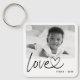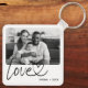 Colagem de fotos moderna com "amor" com chaveiro de coração conectado em letra cursiva.