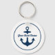 Design de chaveiro náutico redondo apresenta um design simples, branco na moda e azul marinho, estilo costeiro, com sotaque de âncora de barco. Personalize o texto do script personalizado com o nome do seu barco.