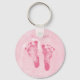 Um chaveiro de anúncio de nascimento de uma menina com pegadas rosa giras contra um fundo rosa macio. Personalize adicionando o nome da sua menina ao texto personalizável que diz: É uma menina. Perfeito para um chá de fraldas.