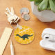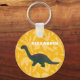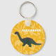 Crie um presente personalizado perfeito para fãs de dinossauros jovens e velhos. Esta chaveiro apresenta uma foto de um dinossauro apatossauro de brinquedo plástico em verde com sotaques vermelhos ferrugem contra um fundo amarelo brilhante com um padrão de fósseis de pegadas de dinossauros. Adicione o seu próprio nome ou outro texto em letras brancas a negrito.