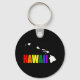 O nome do estado do Havaí em cores do arco-íris, junto com a forma preta e branca das ilhas havaianas.