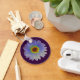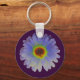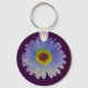Essa bonito chaveiro apresenta uma fotografia de uma flor de marigold que foi manipulada para criar uma bela flor com uma mistura de cores do arco-íris. A flor está sobre um fundo roxo escuro dramático.
