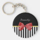 Um elegante chaveiro básico com listras verticais pretas e brancas, embelezado com uma fita colorida FAUX chic e uma imagem de um arco clássico do estilo fita vermelha. Personalize-o adicionando o nome daquela garota especial na sua vida. Imagem plana, NÃO metálica ou arco real.