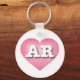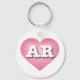 Este chaveiro apresenta um coração calmo, legal e colecionado cor-de-rosa com um centro lavado em branco que contém as letras maiúsculas, em negrito, branco, AR, a abreviação oficial para Arkansas, o estado natural.