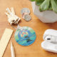 2 golfinhos nadando no oceano perto de uma bela ascensão de cores e água com 2 planetas, uma lua e um sol colorido. Cor rosa, azul, aqua, amarela e verde na água e no céu.