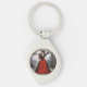 Renderização digital em 3D de um belo feiticeiro feminino em um vestido vermelho e preto com asas em um fundo de castelo fantasticamente assustador