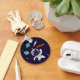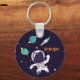 Um chaveiro personalizado com um fundo azul escuro com estrelas amarelas espalhadas ao redor. Camadas sobre o topo é uma ilustração de um espaçador vestindo um traje astronauta branco flutuando no espaço. À distância estão planetas com anéis e um foguete a explodir em lugares desconhecidos.