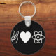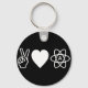 Uma mão erguida em um sinal de paz "V", um coração, e um símbolo ateu soletra "Ateísmo de Amor pela Paz".