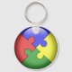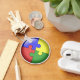 Promover a consciência do autismo. Peças de quebra-cabeça vermelho, amarelo, azul e verde formam uma roda de pinos colorida no meio desse design em negrito. Parece excelente em botões, t-shirts e muito mais.