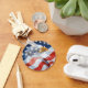 Chaveiro Patriótico com uma bela foto de perto de uma águia careca sobreposta à bandeira americana.