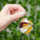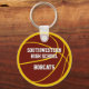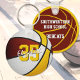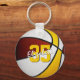 Este chaveiro de tema de basquete fácil de personalizar apresenta a imagem realista de uma bola de basquete que tem painéis coloridos alternados de marrom, branco e ouro na frente e uma forma simples de basquete de marrom no verso - personalize facilmente com o nome do jogador & número de jersey na frente e na escola ou nome do clube & mascot no verso - por katz_d_zynes