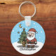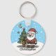 Adicione seu nome para personalizar este chaveiro fofo do Papai Noel de Natal. Espalhe alegria festiva de Natal com este Papai Noel de desenho animado usando um chapéu e roupa de Natal vermelhos e brancos, de pé ao lado de uma árvore de Natal verde adornada com luzes coloridas e uma estrela amarela. Ele está segurando uma lanterna para iluminar a cena de inverno nevada. Abaixo da ilustração há um modelo para adicionar seu nome para personalizar.