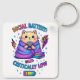 Design vibrante e colorido com um gato aconchegante embrulhado em um cobertor, sentado ao lado de uma pilha de livros tomando café. O texto colorido diz: "Bateria social criticamente baixa". Esse design está disponível em uma grande variedade de produtos.