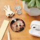 Bebê em um saco Maltês Cachorro-Fotografia de um filhote de maltês branco miniatura descansando em um saco (carro de estimação). A bolsa é marrom-chocolate com bolinhas cor-de-rosa e cor-de-rosa e amarela. O filhote está espiando sua cabeça para fora da janela superior da bolsa e descansando sobre o lado. Puppies língua também sai. Um presente maltês perfeito, fofo como um botão para seus amigos e entes queridos. Veja na Zazzle Stores mais presentes para malteses também. Sinta-se à vontade para personalizar com texto para vestir, adicione um nome de filhotes, se quiser.