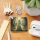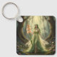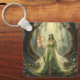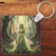 Uma bela fada vestindo um vestido verde-claro fluente e joias feitas de peridôs com pedras peridot em seu longo cabelo verde-claro e asas translúcidas como a libélula, segurando um gladiolus caminha em uma floresta mágica cercada por flores rosa e azuis e árvores cobertas de videira.