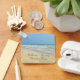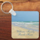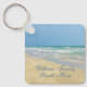 Belo chaveiro de praia com uma fotografia maravilhosa à beira-mar com um sangrento bonito na beira das ondas do oceano num dia ensolarado de verão. Lindas ondas de água verde-azul rolam para a costa arenosa onde seu nome é personalizado em uma fofa tipografia azul. Um belo presente da ilha tropical.