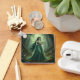 Uma bela fada vestindo um vestido verde fluente e um colar feito de esmeraldas com pétalas lírios do vale em seu longo cabelo verde esmeralda e asas verdes iridescentes de libélula verde-clara segurando um lírio do vale numa floresta mágica cercada de flores azuis e amarelas, lírios do vale e árvores cobertas de musgo.