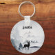 Uma cadeia-chave com uma imagem aquosa com uma rena de silhueta preta entre alguns pinheiros. Esquema de cor neutra a preto e branco.