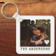 Corrente de chave com foto de Sr. e Sra. com texto de ano de aniversário e nome da família em coração. Ótimo para chá de panela ou aniversário de casamento.